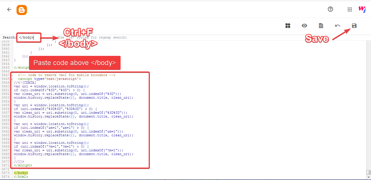 To change the HTML code go to Theme > click on 3 dots and select HTML. Click on Ctrl+F to find code in HTML. Type </body> and enter once above the body closing tag and paste one principle that I shared with you in the download button. Then click on Save to save blogger HTML.